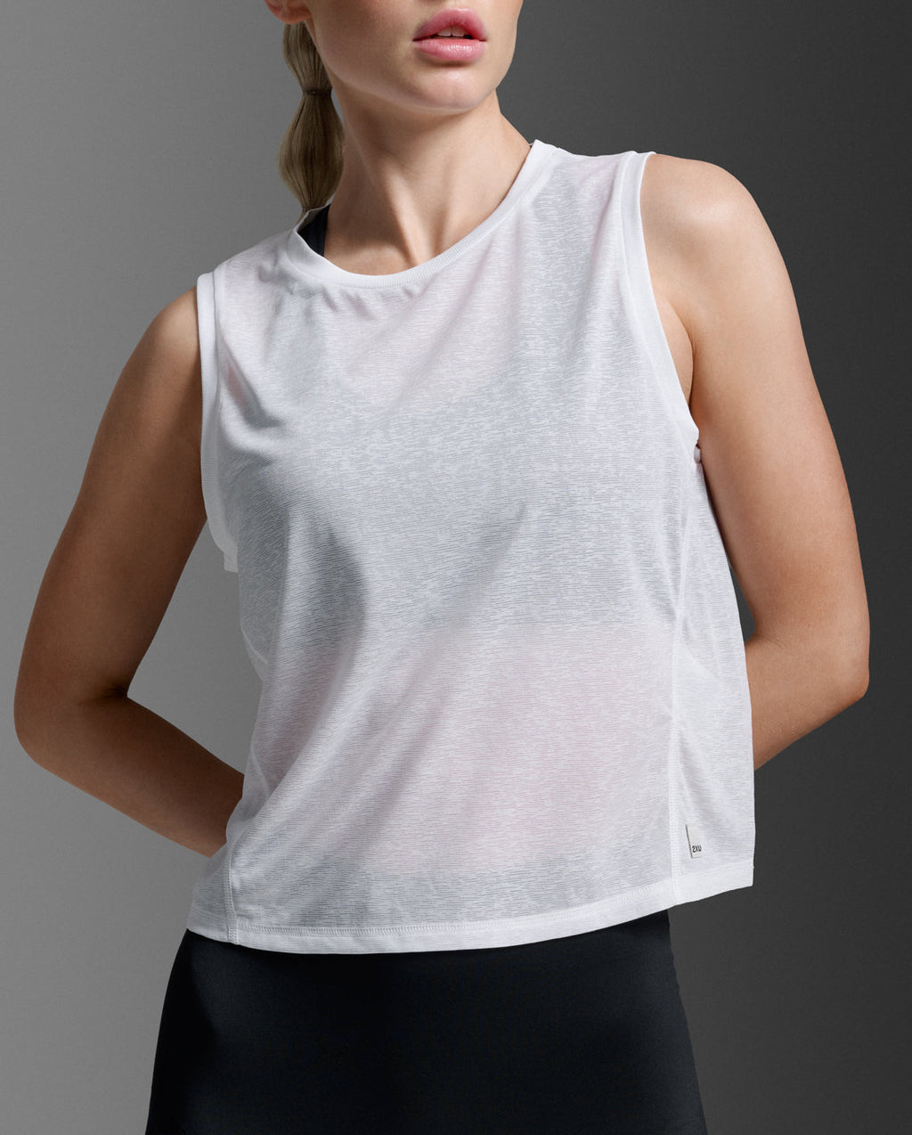 Återvunnen texturerad performance sheer tyg gör att du kan ge allt utan att behöva oroa dig för att tyget ska klibba fast.